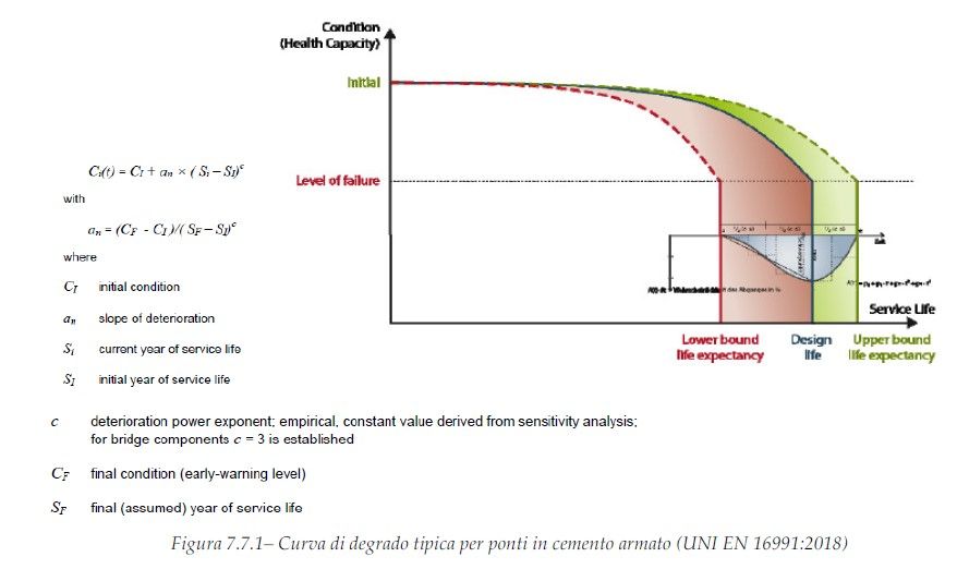 È del tutto evidente che medesime misure di avanzamento di un degrado o di una anomalia non hanno lo stesso significato se corrispondenti a differenti spazi riportati in figura, in quanto agirebbero in differenti condizioni di salute del manufatto. Ciò dovrebbe sempre indurre a fissare su ogni opera di nuova realizzazione indicatori del suo stato di conservazione, in modo da disporre di opportuni parametri di confronto con il tempo di zero della messa in esercizio.