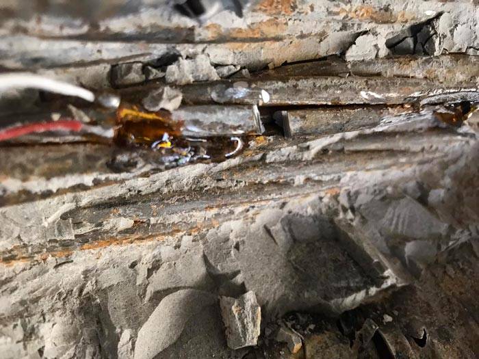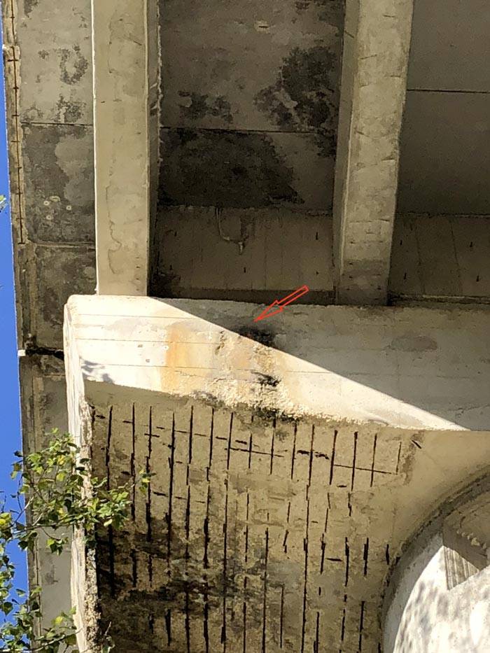 Fig 4 . Fessurazione interna al corpo del pulvino creatasi per getto massivo. Unico indizio di fessurazione è una macchia di ruggine con diposizione anomala.